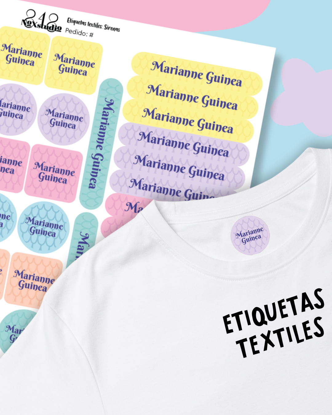 Incluye: 3 plantillas textiles con 90 etiquetas de diferentes tamaños y colores
