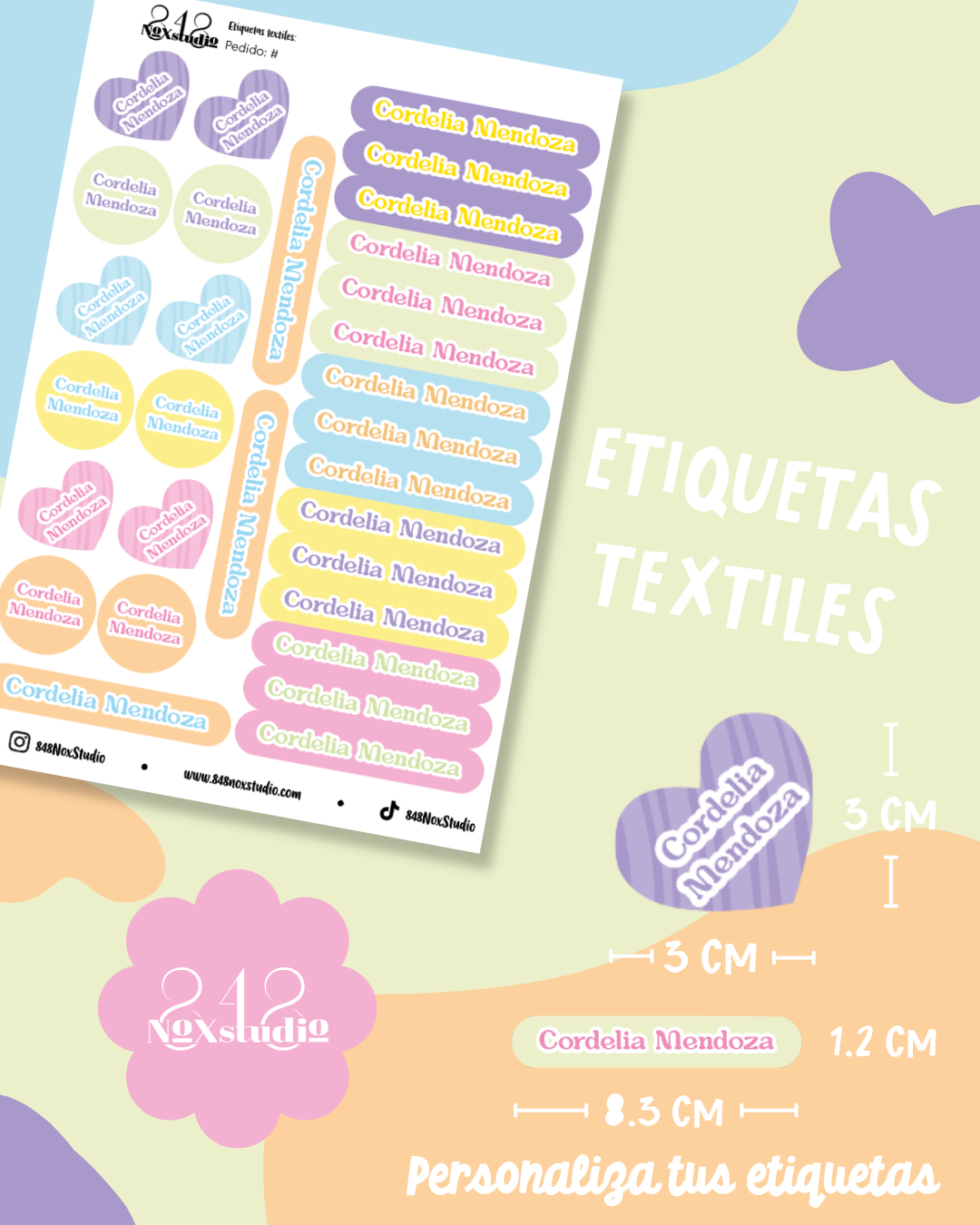 Incluye: 3 plantillas textiles con 90 etiquetas de diferentes tamaños y colores