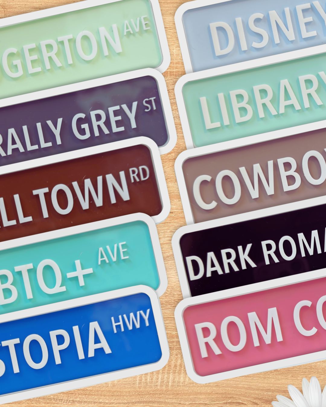 Dale personalidad a tu librero con nuestros letreros de acrílico inspirados en señalizaciones de calles. Cada pieza está diseñada para destacar tus géneros favoritos, organizar tus estanterías y añadir un toque único y moderno a tu espacio lector.